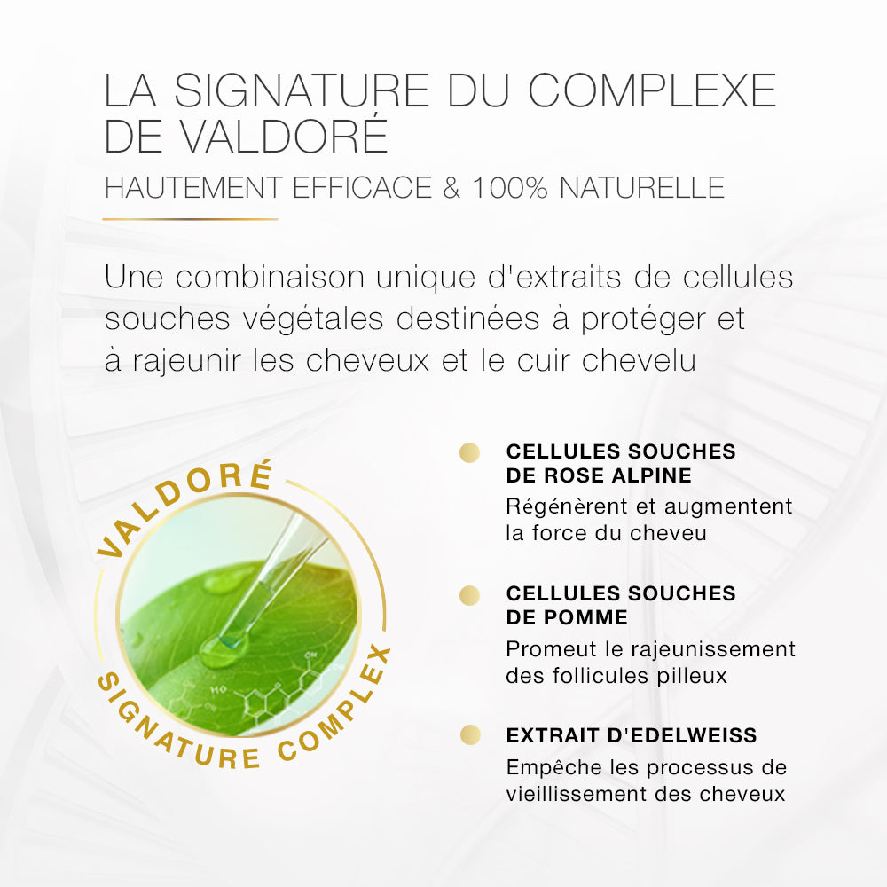 Les cellules souches végétales accumulent l'énergie végétale : elles contiennent une énorme quantité de facteurs de croissance et de peptides responsables de la régénération rapide. Lorsqu'elles atteignent la surface de la peau humaine, elles signalent aux cellules qu'elles doivent commencer à se régénérer. La synthèse naturelle des protéines propres aux cellules de la peau, le collagène et l'élastine, s'améliore. Les cellules souches végétales peuvent donc améliorer l'état du cuir chevelu et des follicules pileux, prolonger le cycle de vie des cellules et stimuler la croissance des cheveux.